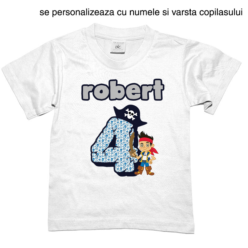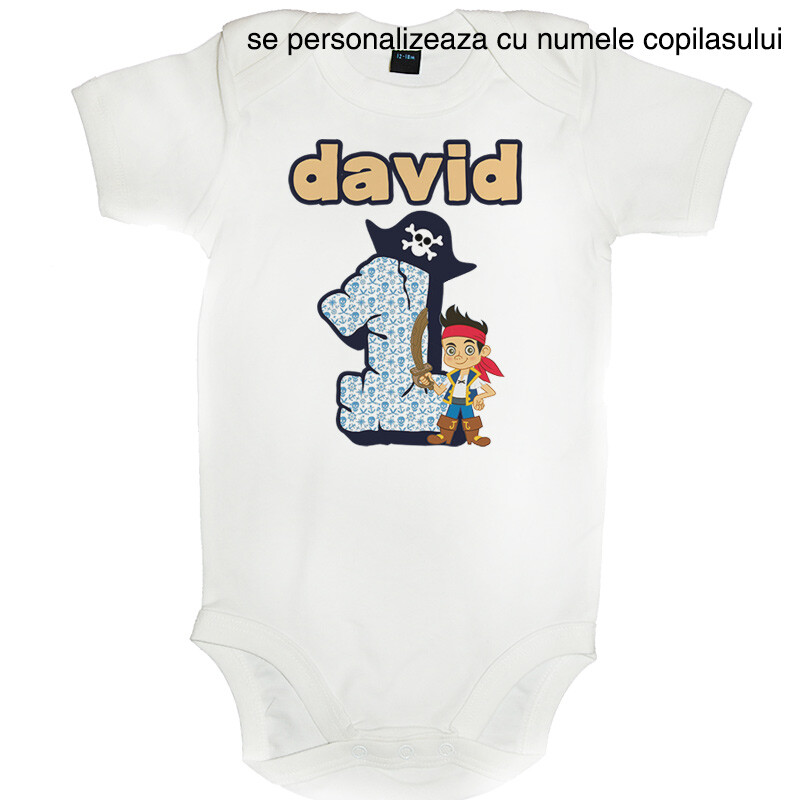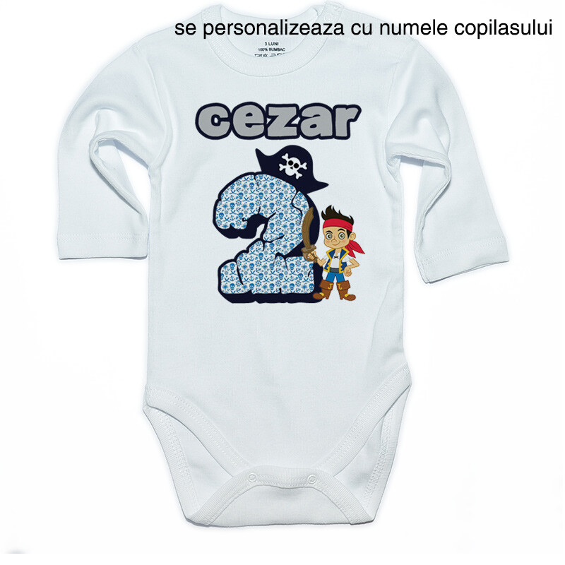 Tricou sau body personalizat pentru copii, cu imprimeu cu pirati, cadoul perfect pentru o petrecere aniversara, cu desen imprimat digital, direct in tesatura tricoului, cu vopsele pe baza de apa, fara potential alergen. Toate produsele sunt din bumbac 100%.