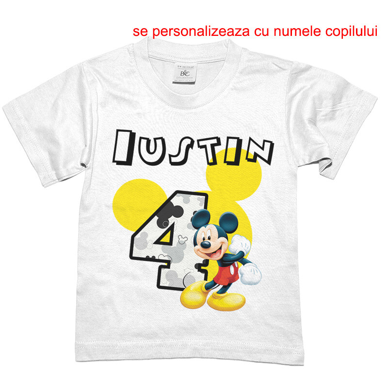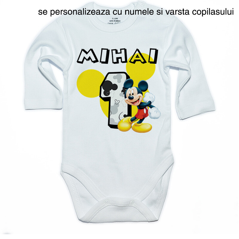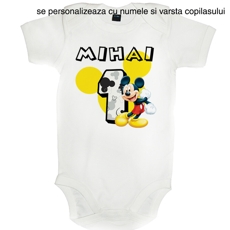 Tricou sau body personalizat pentru copii, cu imprimeu cu Mickey Mouse ,cadoul perfect pentru o petrecere aniversara, cu desen imprimat digital, direct in tesatura tricoului, cu vopsele pe baza de apa, fara potential alergen. Toate produsele sunt din bumbac 100%.