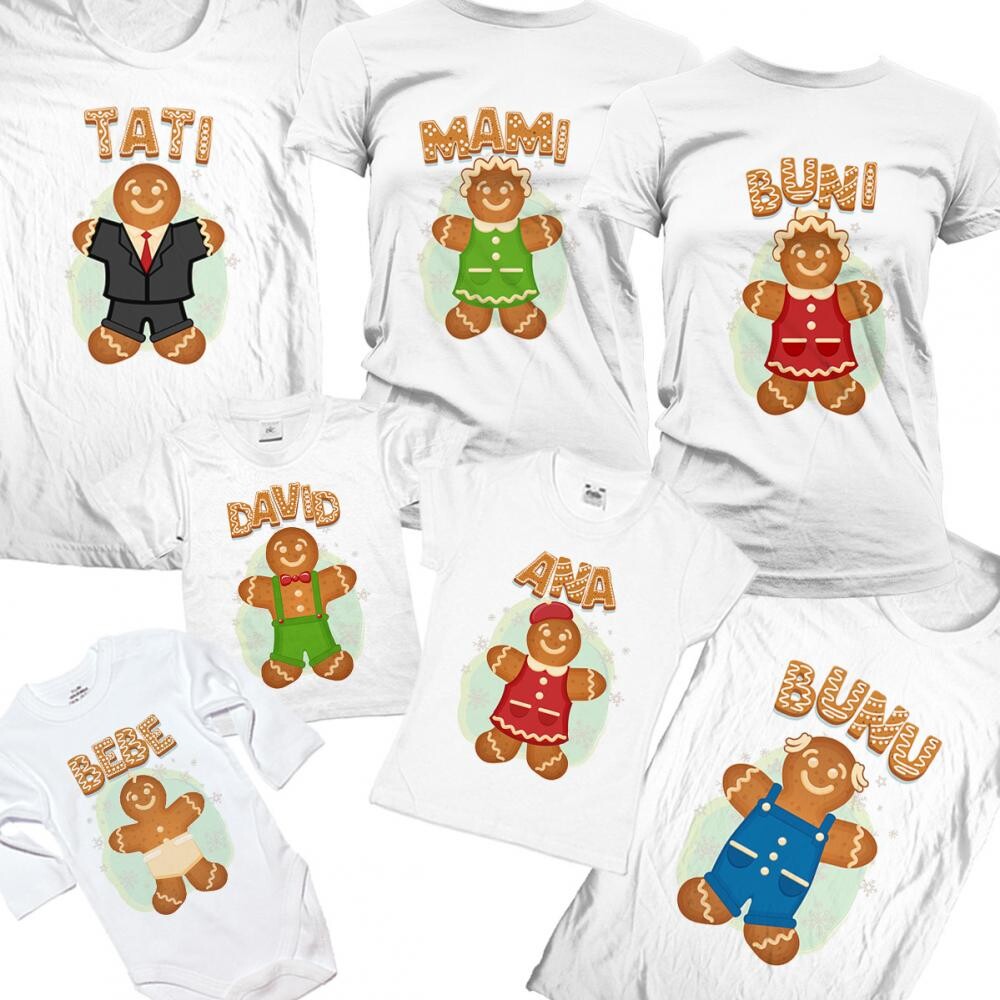 Set de tricouri pentru familie cu familia de turta dulce. Se pot folosi pentru o sedinta foto sau cadou pentru Craciun. Tricourile sunt de calitate superioara, din bumbac 100%, grosime medie (190 grame tricourile barbatesti si aproximativ 140-160 cele de femei si copii).