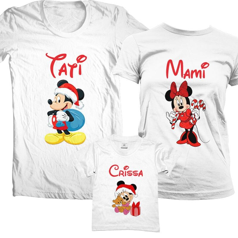 Set personalizat pentru familia de 3 persoane cu Mickey si Minnie de Craciun. Tricourile personalizate se pot folosi pentru sedinte foto sau pentru a adauga savoare unei petreceri de Craciun.
