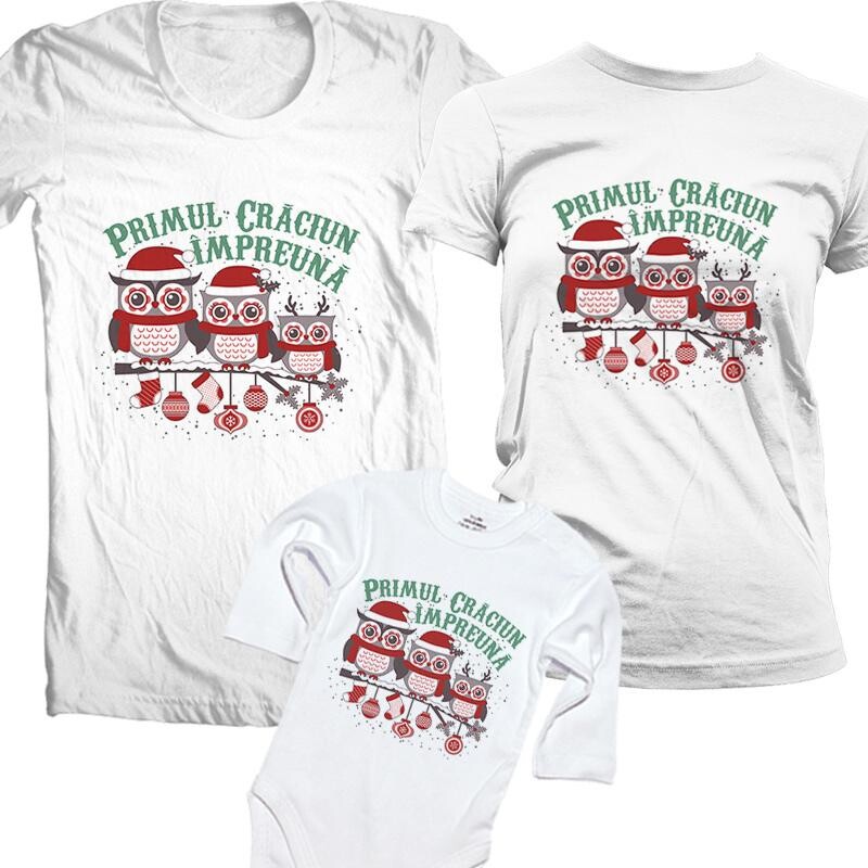 Set personalizat pentru familia de 3 persoane pentru Craciun cu bufnite. Tricourile personalizate se pot folosi pentru sedinte foto sau pentru a adauga savoare unei petreceri de Craciun.