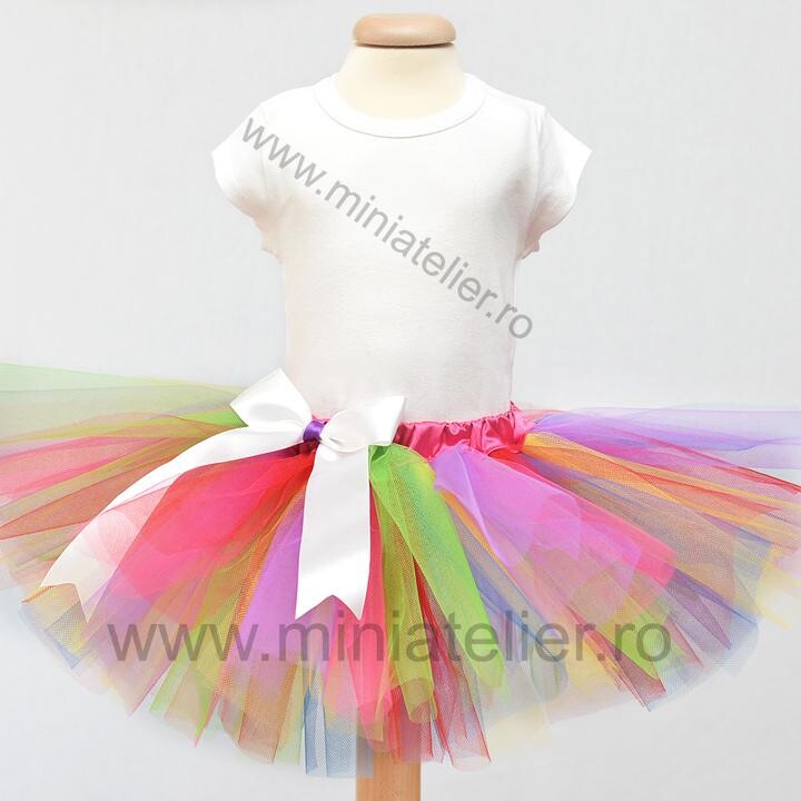 Fustita tutu este pe elastic, din tul foarte moale, de calitate superioara, ales special ca sa nu incomodeze fetita in nici un fel. Talia este elastica si acoperita cu satin si lungimea este in general calculata acopere jumatate din pulpa piciorului, in asa fel incat, in momentul in care se umfla din cauza miscarii, sa fie o fustita mini Fustitele sunt accesorizate cu benzi colorate, tematice