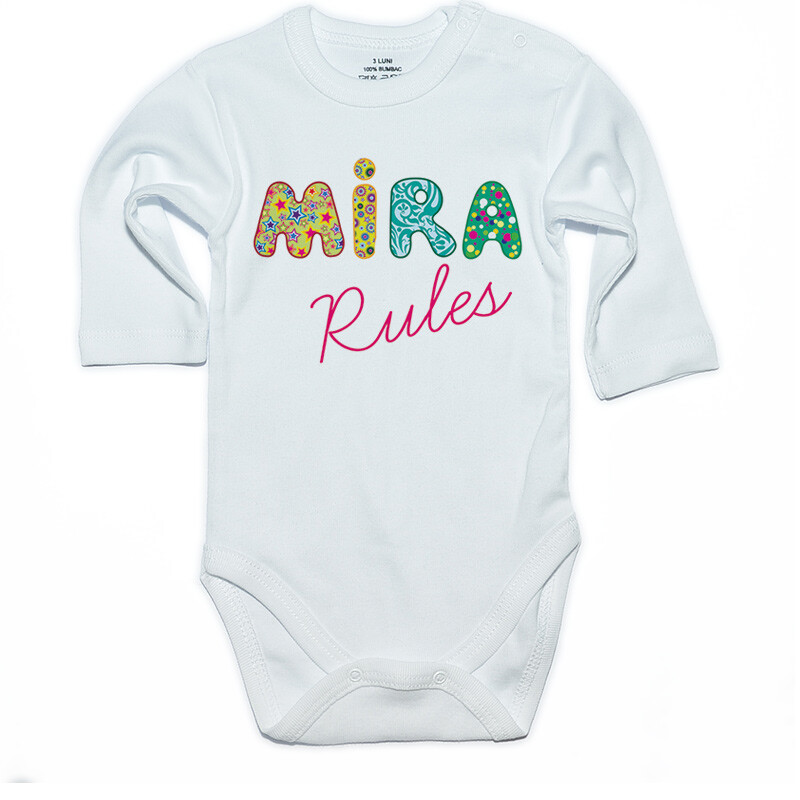 Tricou sau body personalizat pentru copii, cu imprimeu personalizat cu numele copilului, cadoul perfect pentru o petrecere aniversara, cu desen imprimat digital, direct in tesatura tricoului, cu vopsele pe baza de apa, fara potential alergen. Toate produsele sunt din bumbac 100%.