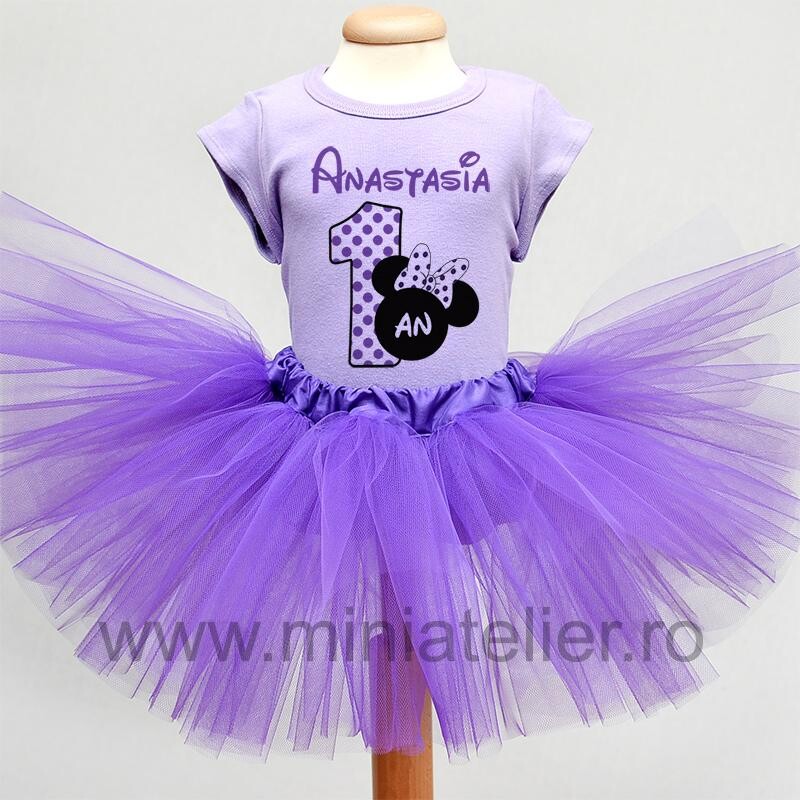 Set aniversar in editie limitata disponibil doar pentru varsta de 1 an cu tema Minnie Mouse pentru o fetita care indrageste culoarea mov.