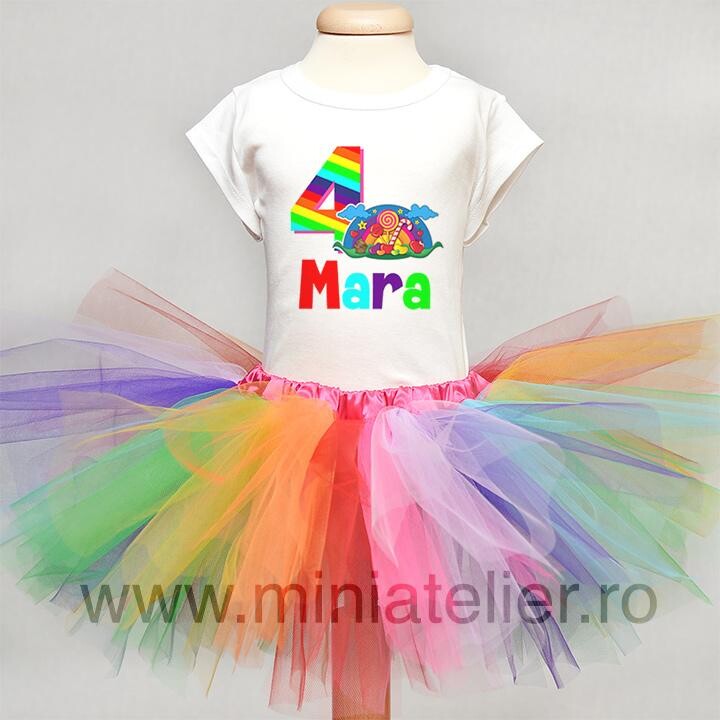 Compleu body sau tricou si fustita tutu cadoul perfect pentru aniversare cu top din bumbac 100% imprimat cu varsta si numele fetitei si un tutu foarte fluffy in culori asortate.