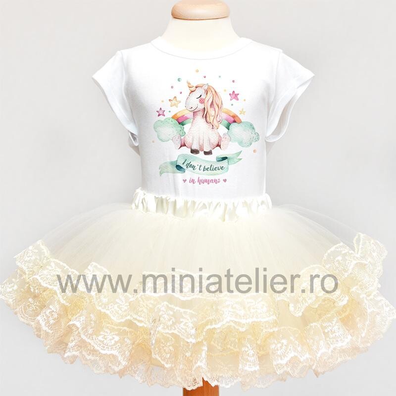 Set cu fustita din tulle cu dantela si body sau tricou din bumbac 100% imprimat digital cu un unicorn simpatic.
