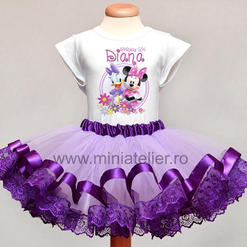 Set aniversar cu fustita din tulle cu dantela si satin lila si mov si body sau tricou din bumbac 100% imprimat digital cu Minnie si Daisy si numele fetitei Dvs.