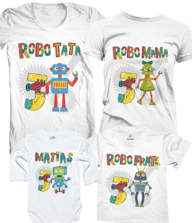 Set de tricouri pentru familie aniversar cu tematica BABY ROBOT. Se pot folosi pentru o sedinta foto sau cadou pentru aniversare. Tricourile sunt de calitate superioara, din bumbac 100%, grosime medie (190 grame tricourile barbatesti si aproximativ 140-160 cele de femei si copii).
