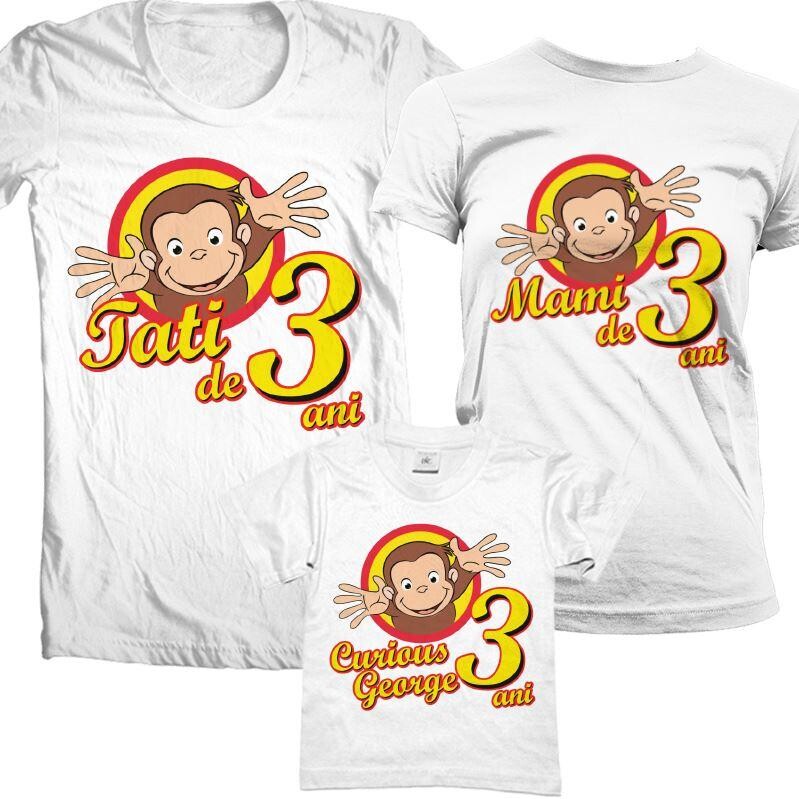 Set de tricouri pentru familie aniversar cu tematica CURIOUS GEORGE. Se pot folosi pentru o sedinta foto sau cadou pentru aniversare. Tricourile sunt de calitate superioara, din bumbac 100%, grosime medie (190 grame tricourile barbatesti si aproximativ 140-160 cele de femei si copii).